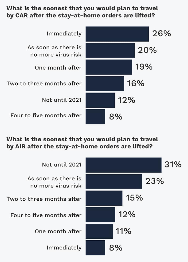 Americans will travel by car but are hesitant to get on an airplane. The study reported that 31% won’t travel by air until 2021, but 26% will travel by car immediately and 20% will once there is no more virus risk.